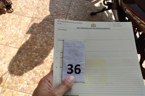 Langkah selanjutnya dalam cara balik nama STNK adalah melakukan cek fisik motor. Pada tahap ini, biasanya motor kita diminta untuk dibawa ke bagian cek fisik. Dan menunggu giliran untuk cek fisik motor. Petugas akan menggesesk beberapa bagian motor kita, untuk mendapatkan nomor rangka dan nomor mesin kendaraan.