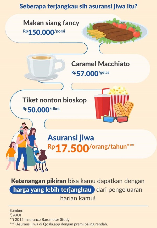 Masih ragu dalam membeli dan menjatuhkan pilihan asuransi jiwa terbaik karena khawatir biaya yang selangit? Tenang, biaya asuransi jiwa sebenarnya sangat terjangkau, lho. Gambar berikut ini bisa jadi acuan kamu seberapa hemat memiliki asuransi jiwa ketimbang daily expenses lainnya yang biasa kamu keluarkan tiap hari maupun bulanan.
